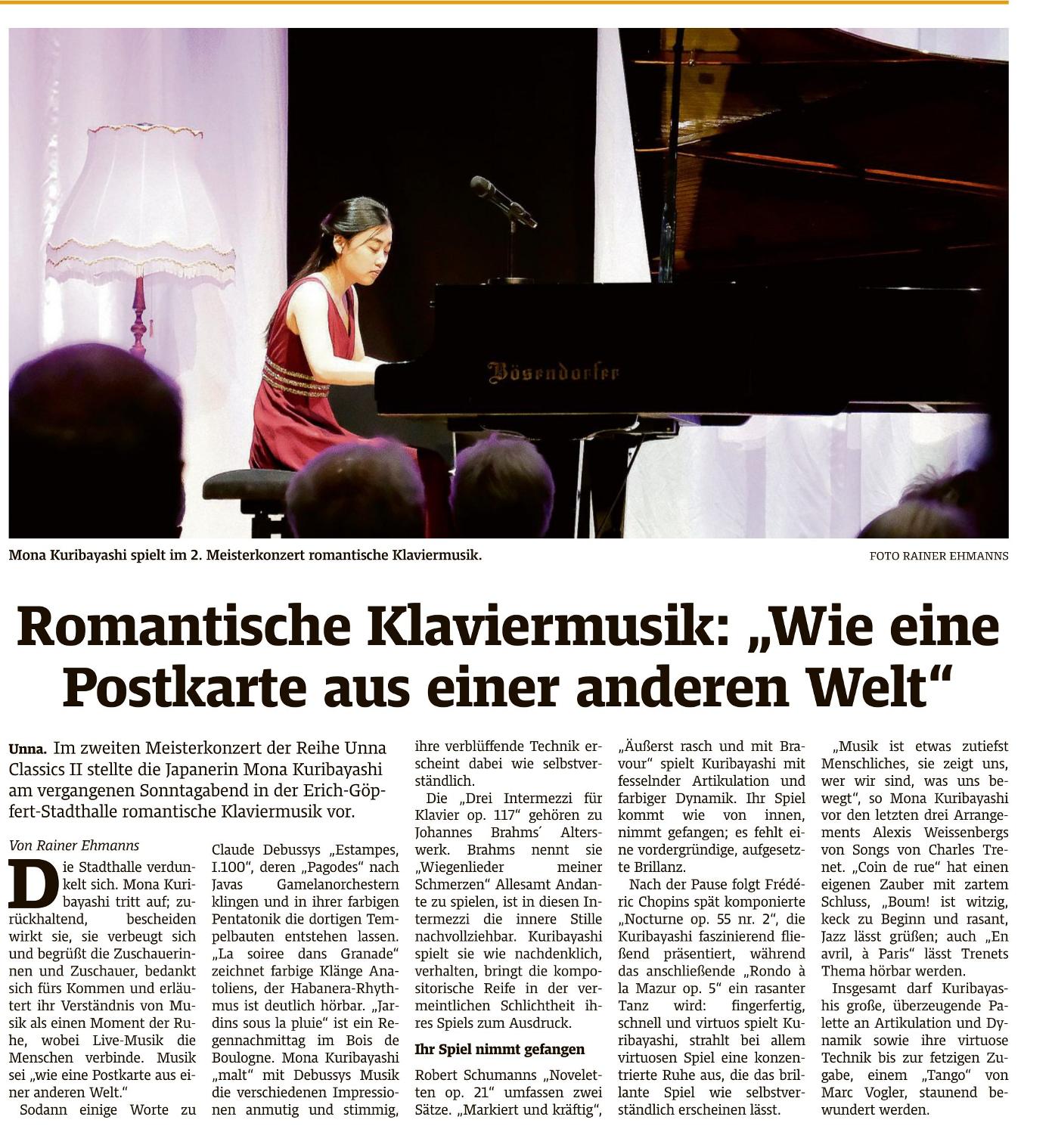 Der Musikverein Unna e.V. ist Träger des KonzertChors Unna und Veranstalter von Meisterkonzerten. Der KonzertChor setzt sich aus Sängerinnen und Sängern aus Unna und Umgebung zusammen und führt große Chorkonzerte auf. Bei den Meisterkonzerten präsentieren hochbegabte Musikerinnen und Musiker ihr Talent.